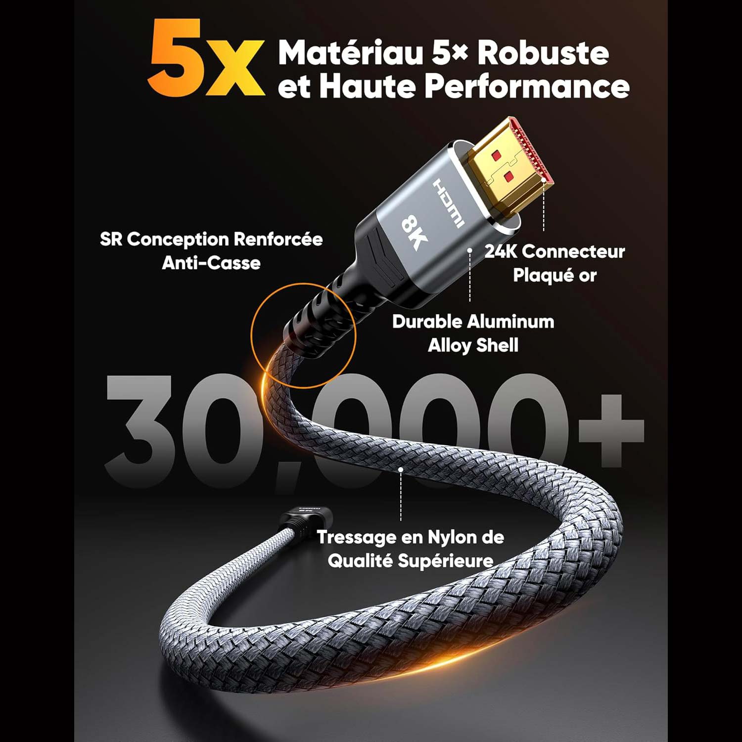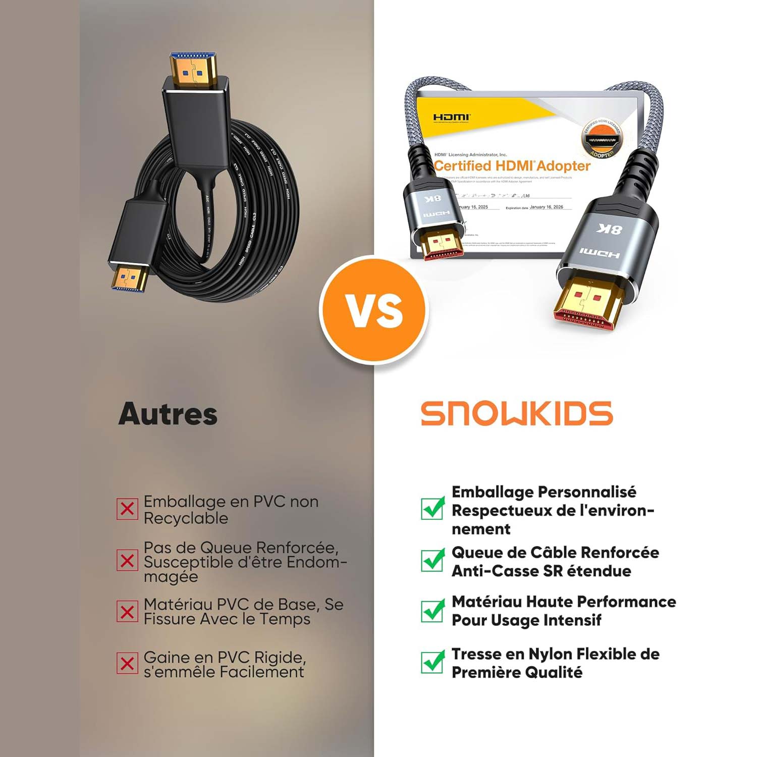 - Matériaux durables de qualité militaire : Ce Câble HDMI 8K présente le style classique le plus populaire de Snowkids. Il est doté d’une couverture en nylon tressé de haute qualité, de connecteurs plaqués or et d’un boîtier en alliage d’aluminium de première qualité avec une conception anti courbure pour une durabilité accrue.
