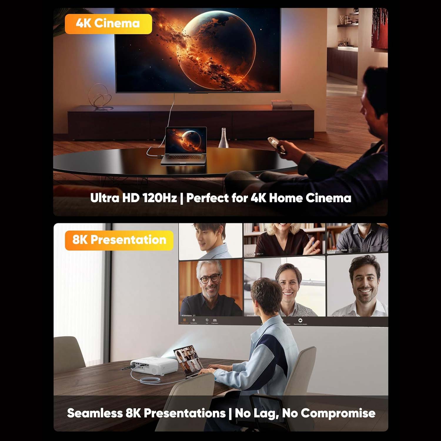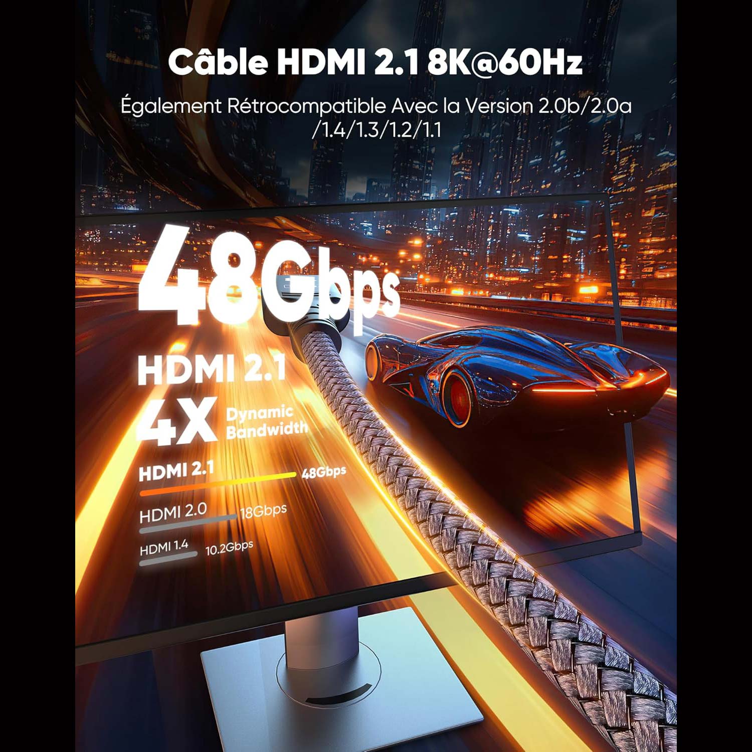 - Câble HDMI 2.1 : Prend en charge la résolution ultra-haute vitesse 10K 8K@60Hz, 4K@120Hz, 4K@60Hz, 2K@144Hz, rétro compatible avec la version HDMI 2.0/1.4/1.3/1.2/1.1 pour une transmission fluide et une expérience audiovisuelle améliorée.