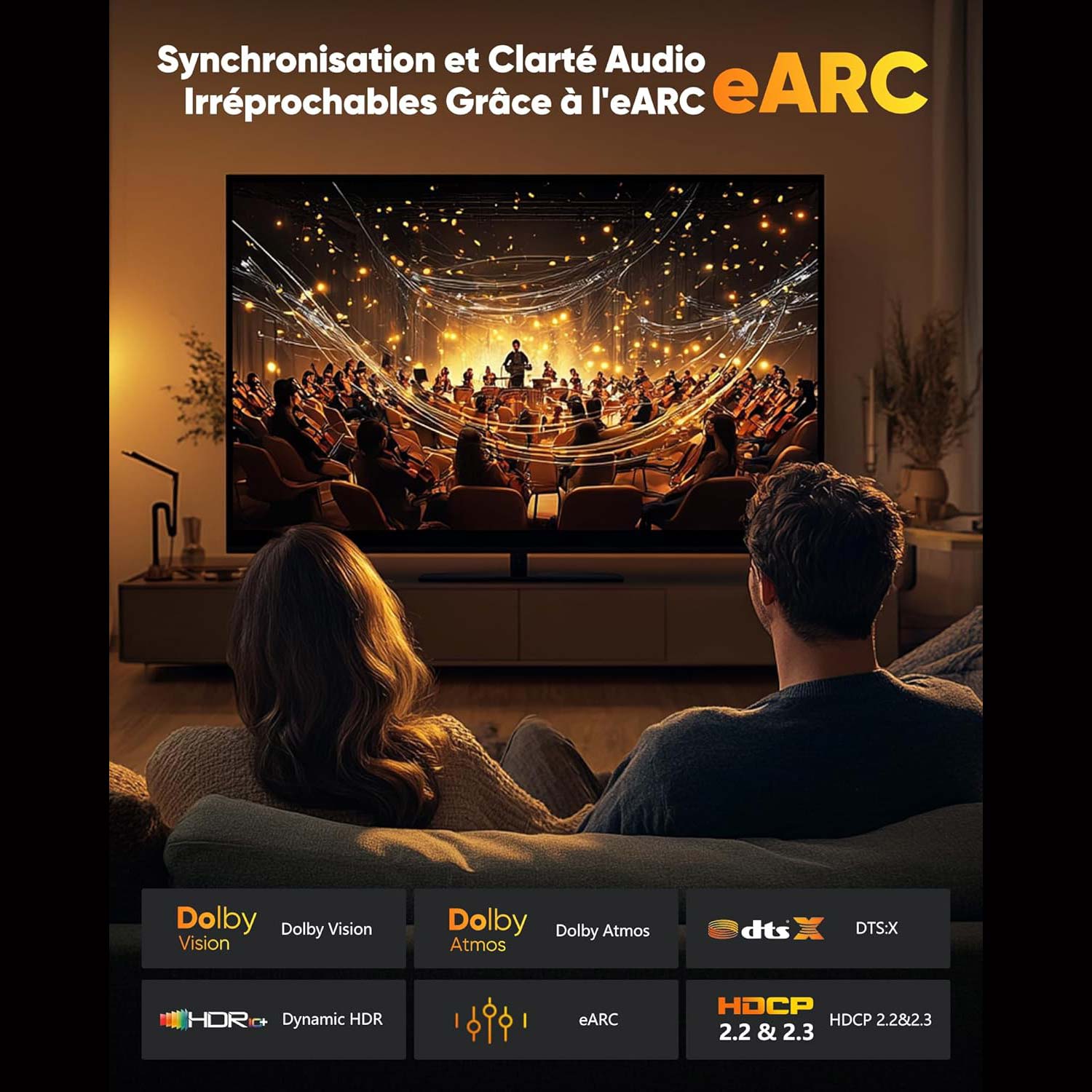 - HDMI Ultra Haute Vitesse : Supporte un taux de transmission maximal de 48 Gbps, HDR, HDCP 2.2 & 2.3, DTS:X. Prend en charge l’affichage vidéo en 3D, Dynamic HDR, eARC, ALLM, QFT, QMS, VRR, Profitez de l’expérience audiovisuelle ultime.