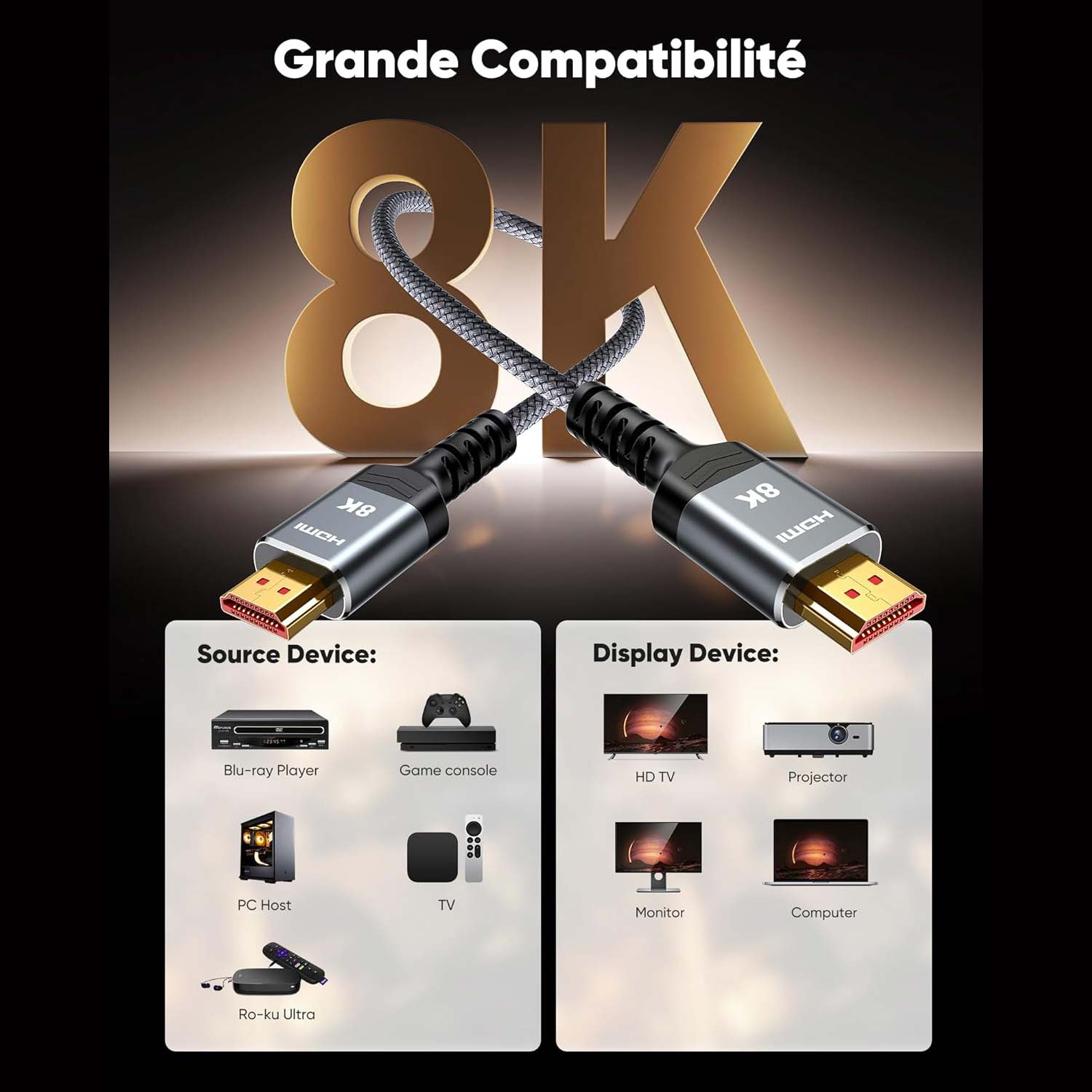 - Compatibilité parfaite : Cable HDMI 2.1 Compatible avec les appareils dotés d’interface HDMI 2.1/2.0/1.4, adapté aux PS-5/4/3, consoles de jeu, lecteurs DVD/Blu-ray, box TV intelligentes, projecteurs, écrans, ordinateurs portables, etc. Répond aux besoins de diverses scènes comme les compétitions de jeu, le travail bureautique et les cinémas maison.