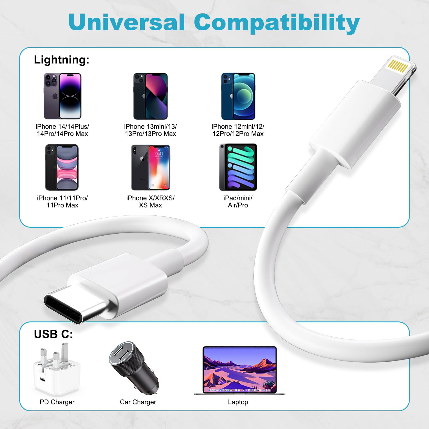 - Large Compatibilité Cable Chargeur Rapide iPhone: Cable iPhone USB C prend en charge la charge rapide PD20W pour iPhone 14/14 Plus/14 Pro/14 Pro Max/13/13 Mini/13 Pro/13 Pro Max/12/12 Mini/12 Pro/12 Pro Max/11/11 Pro/11 Pro Max/XS Max/XS/XR/X/8 Plus/8. Ce câble USB C lightning prend également en charge la charge standard (5 V/2,4 A max) pour iPhone 7 Plus/7/6 Plus/6/6S Plus/6S/5/5S, etc