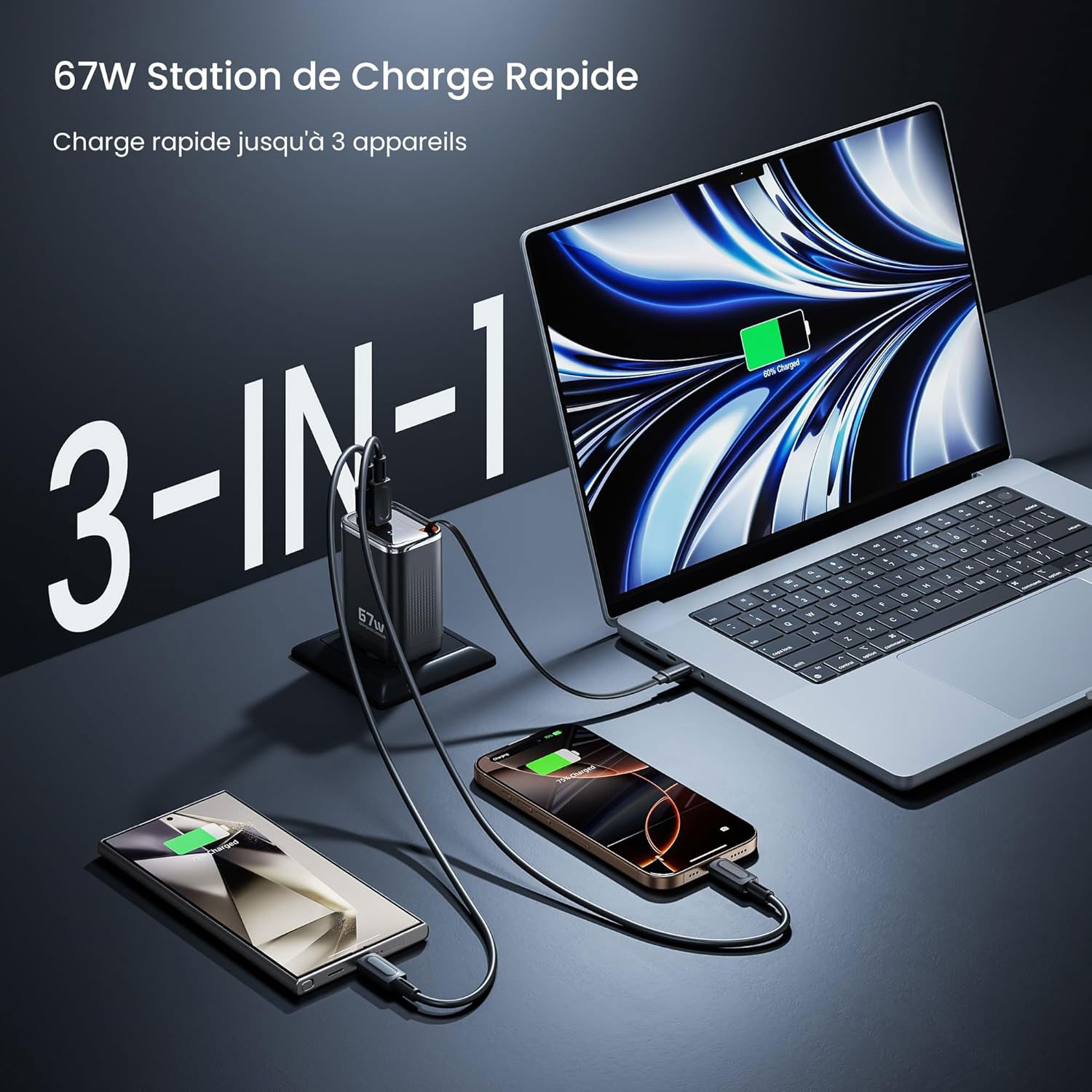 - 3 – in – 1 Multi USB C chargeur 67W: l’adaptateur secteur USB c est équipé d’une alimentation 1 USB – C (max 67w), 1 USB – A (max 30w) et 1 câble de charge rétractable (max 60W) pour charger jusqu’à trois appareils simultanément. Si vous avez besoin de charger 2 appareils rapidement, utilisez la combinaison de câbles de charge USB-C pour profiter de la charge simultanée sans compromettre la vitesse de charge