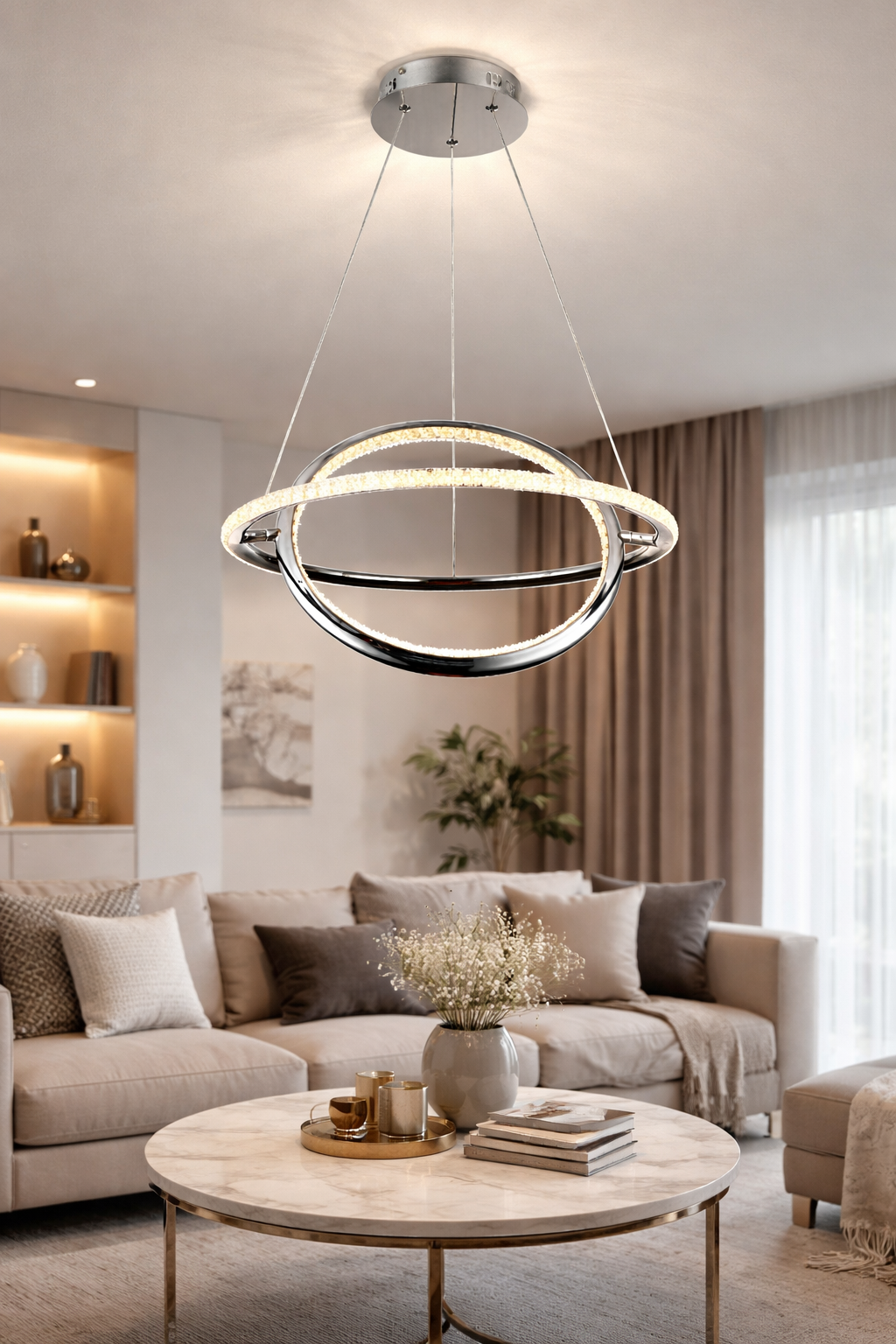 Lampe en suspension de style nordique, formée par deux structures circulaires, diamètre 450mm, inclinable pour ajuster l’éclairage dans toutes les directions. Ainsi, la lampe émet un éclairage de 360º (la bague extérieure émet la lumière vers l’extérieur, la bague intérieure vers l’intérieur). Le diffuseur opale évite l’éblouissement et offre une lumière agréable et douce pour l’œil. En plus, la finition effet quartz / diamant ajoute une touche d’originalité à la lampe.