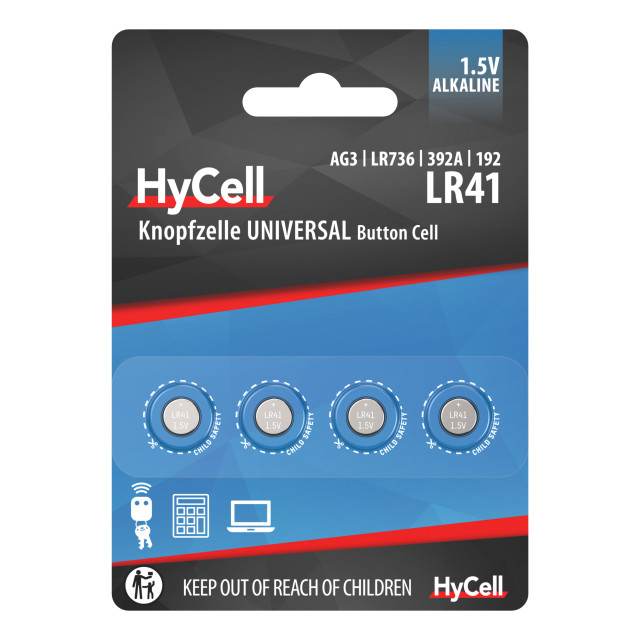 - La pile LR41 (également appelée V3GA) de Hycell est une pile bouton alcaline d’une tension de 1.5v et d’une capacité de 35 mAh.