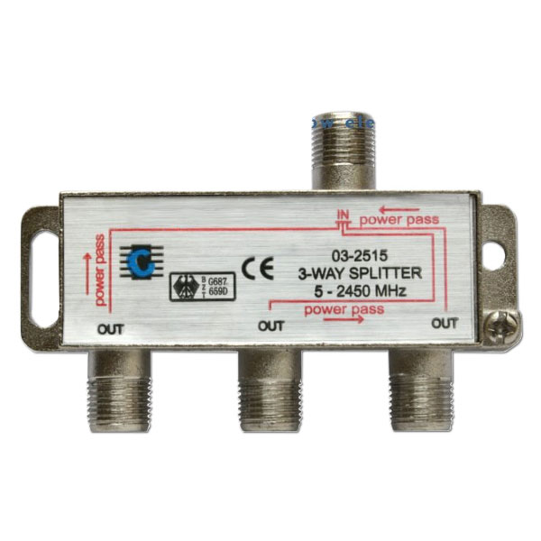 Répartiteur 5 – 2 400 MHz – 3 sorties sous blister Passage Ter : 5.5 dB, Sat : 9.0 dB Passage d’alim. sortie -> entrée avec diodes sur toutes les voies Connectique F