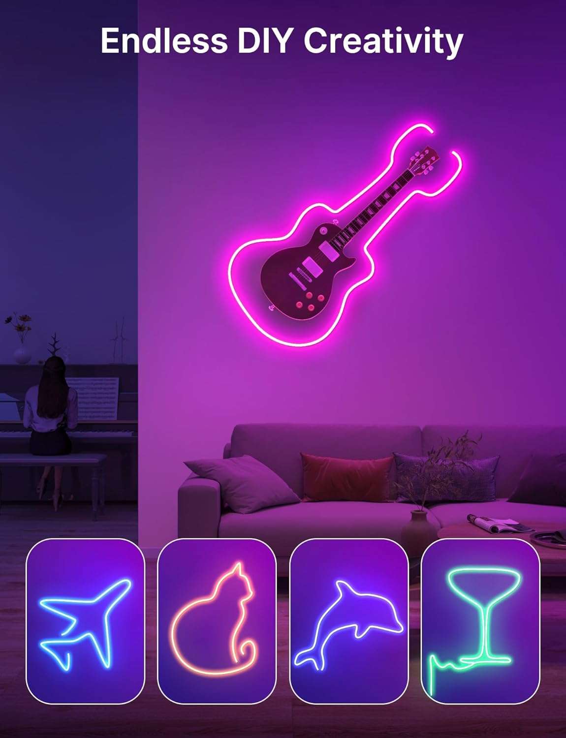 Contrairement aux bandes LED néon standard, les bandes néon Mexllex se distinguent par une longueur de 5 mètres et une grande flexibilité. Vous pouvez les modeler librement pour créer la forme de votre choix et améliorer l’ambiance de votre chambre, salon ou salle de jeux.