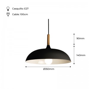 Elle se compose d’un abat-jour en aluminium gris mat, dont l’intérieur (le réflecteur) est laqué en blanc pour une meilleure réverbération de la lumière. Le câble noir de suspension est raccordé à la lampe au moyen d’un élégant tube de bois clair très décoratif. Il mesure 120 cm, mais peut être écourté en fonction de vos besoins en intervenant au niveau de la rosace cache-fils.