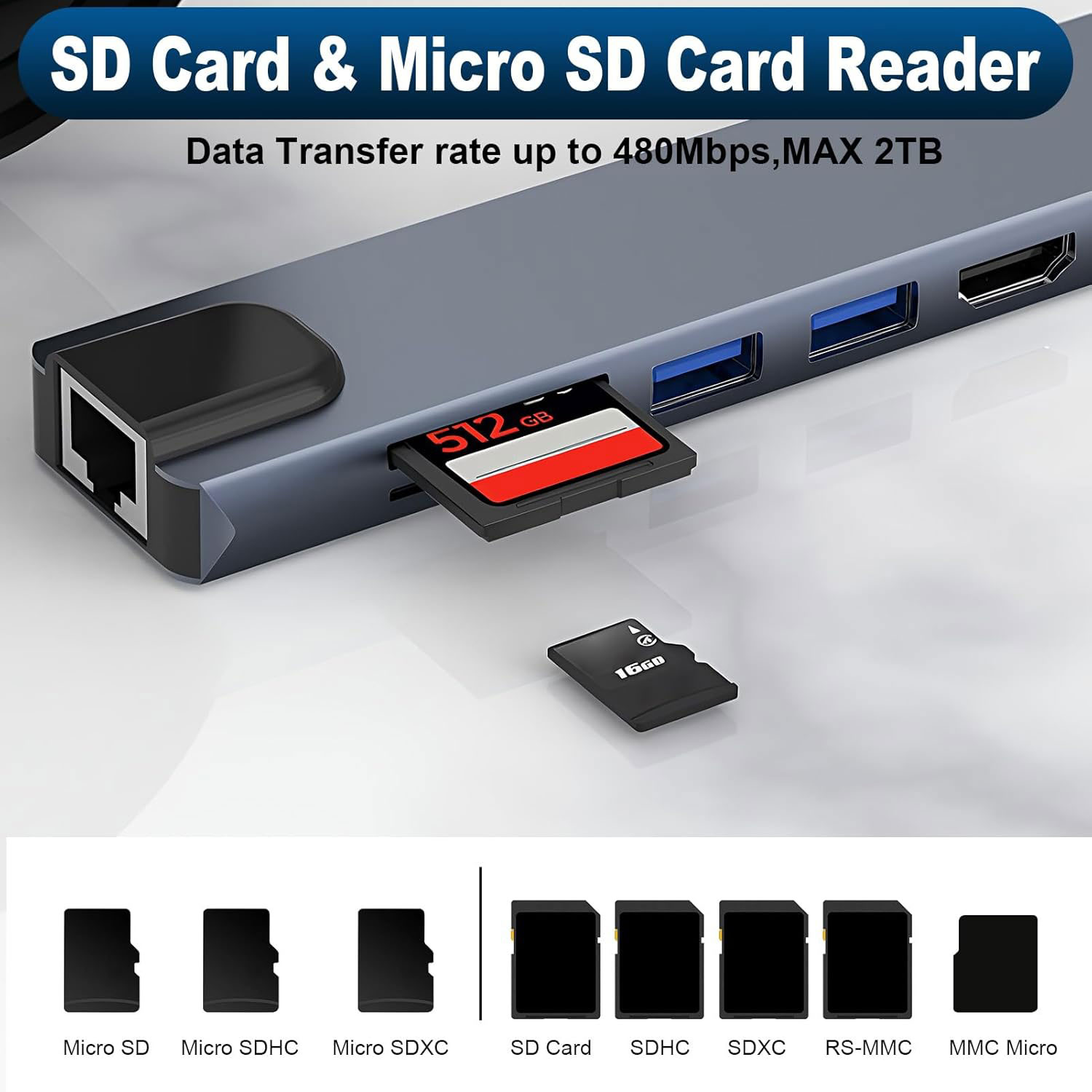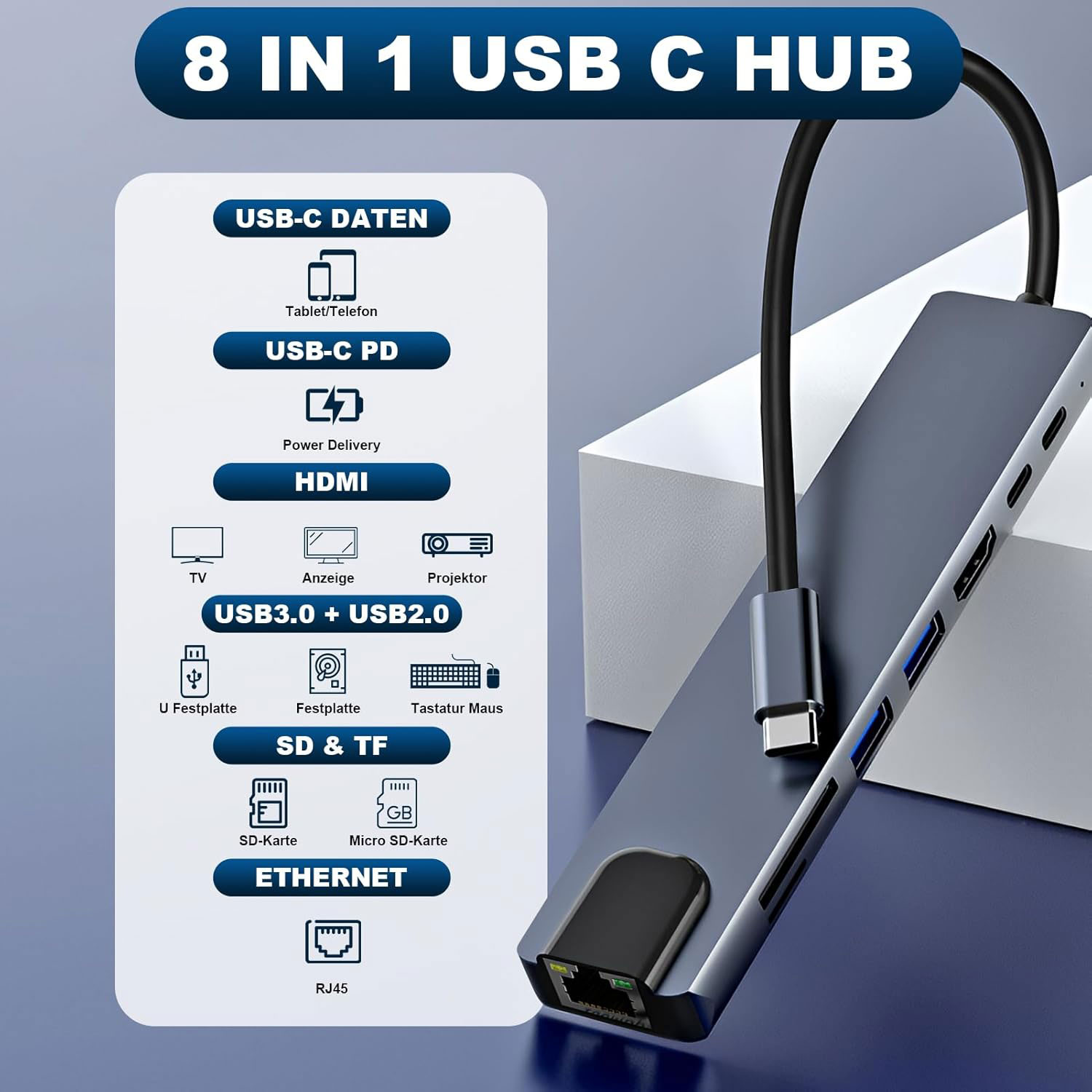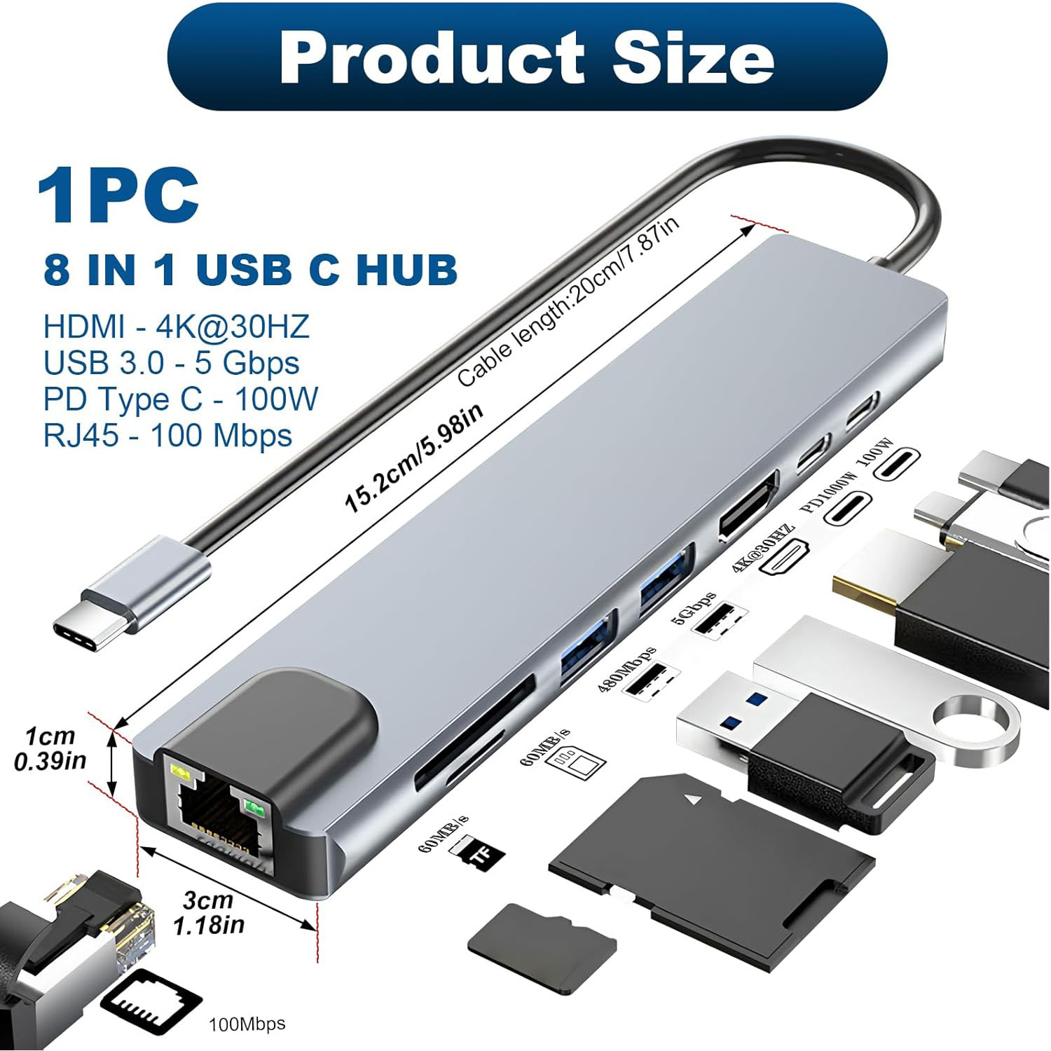 - Hub USB C 8 en 1 avec HDMI 4KHUB USB-C 8-en-1 : Cet adaptateur multiport USB-C pratique intègre 8 ports dans un format compact, dont 2 ports USB 3.0/2.0, un port USB-C, un port HDMI 4K, un lecteur de cartes SD/TF, un port Ethernet RJ45 et une fonction de charge PD 100 W